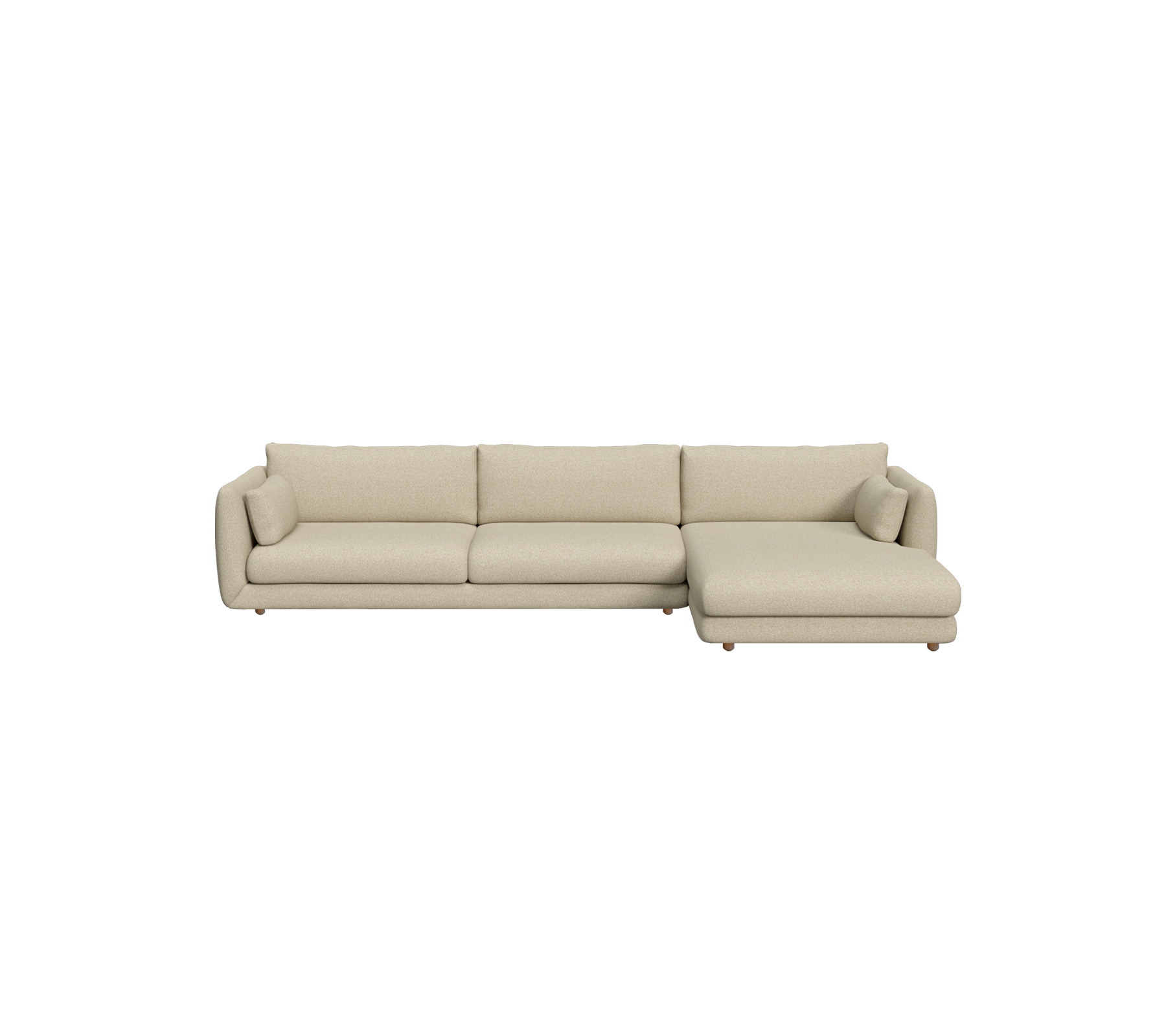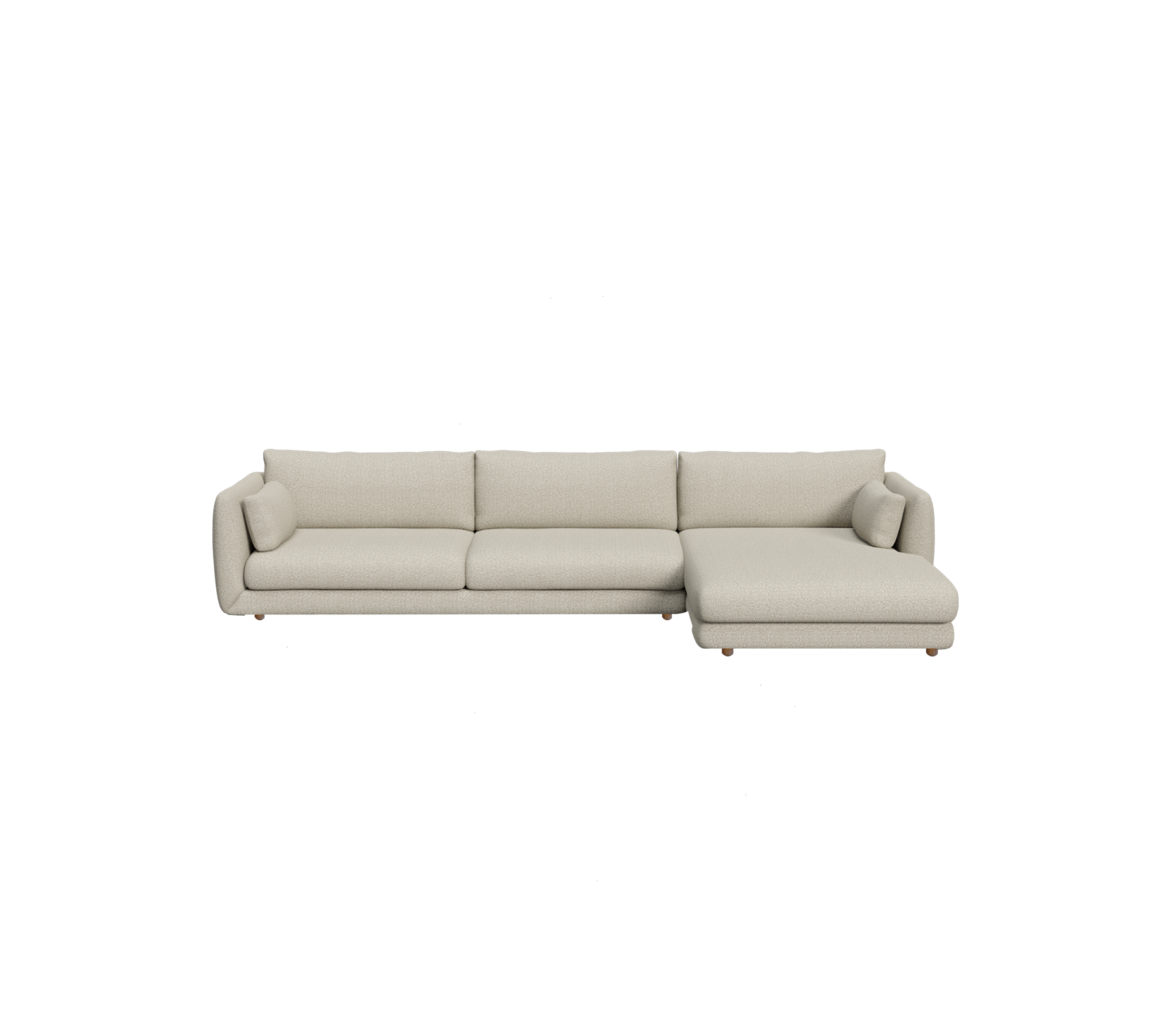 The Bloom 3-seater with left-hand chaise longue by Cane-line Design is a statement piece enriched by the warmth of teak. The sculpted silhouette is set on elegant teak legs, bringing height and visual lightness to the design. The chaise longue provides generous room for unwinding in style, while the deep cushions and refined upholstery offers everyday luxury with a classic appeal. The chaise longue sofa is also available as a [right-hand version with teak legs](/products/Bloom 3-seater sofa with chaise longue, right and teak legs) or with a plinth base for a grounded aesthetic.